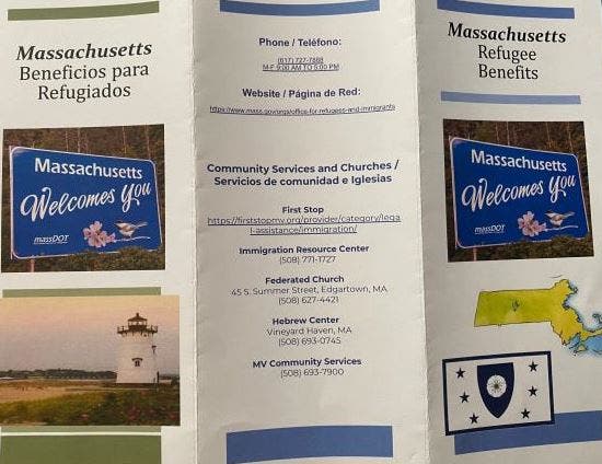The brochures, titled “Massachusetts Refugee Benefits/Massachusetts Beneficios para Refugiados,” are given legitimacy with the inclusion of the Massachusetts flag and state's website on them, as well as a photo of a Massachusetts border sign that reads, "Massachusetts Welcomes You," although Massachusetts Gov. Charlie Baker said the state was unaware of DeSantis' intention to fly planeloads of immigrants to Martha's Vineyard and never signed off on the brochure.