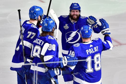Ondrej Palat #18 of the Tampa Bay Lightning and his teammates celebrate a goal against the Montreal Canadiens during the third period in Game One of the 2021 NHL Stanley Cup Finals. The goal was originally credited to Ondrej Palat but was later changed to Nikita Kucherov.