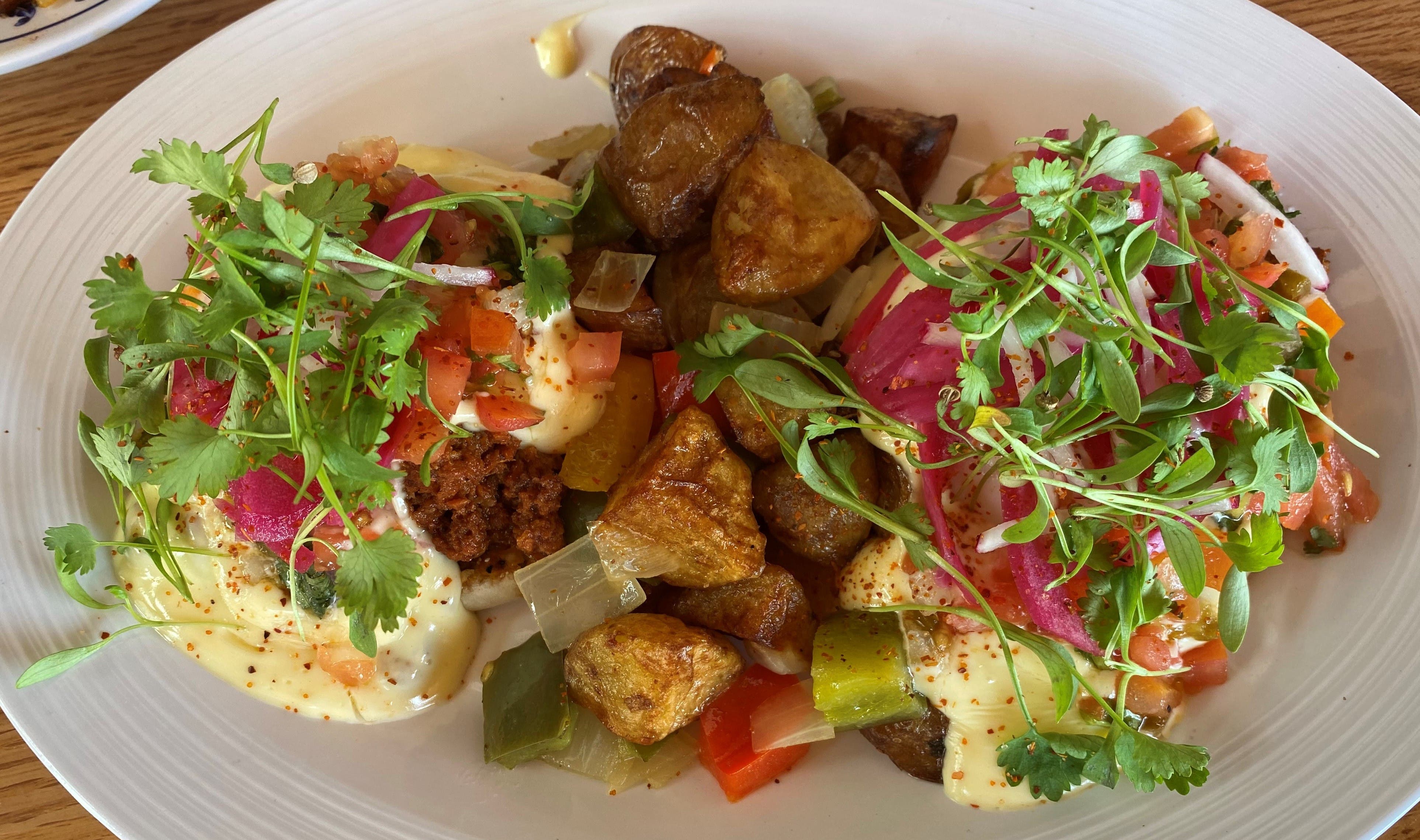 Two poached eggs, Mexican chorizo, toasted English muffin, tequila-lime hollandaise, pico, pickled red onion, radish, cilantro, tajin, side of Mexican home fries