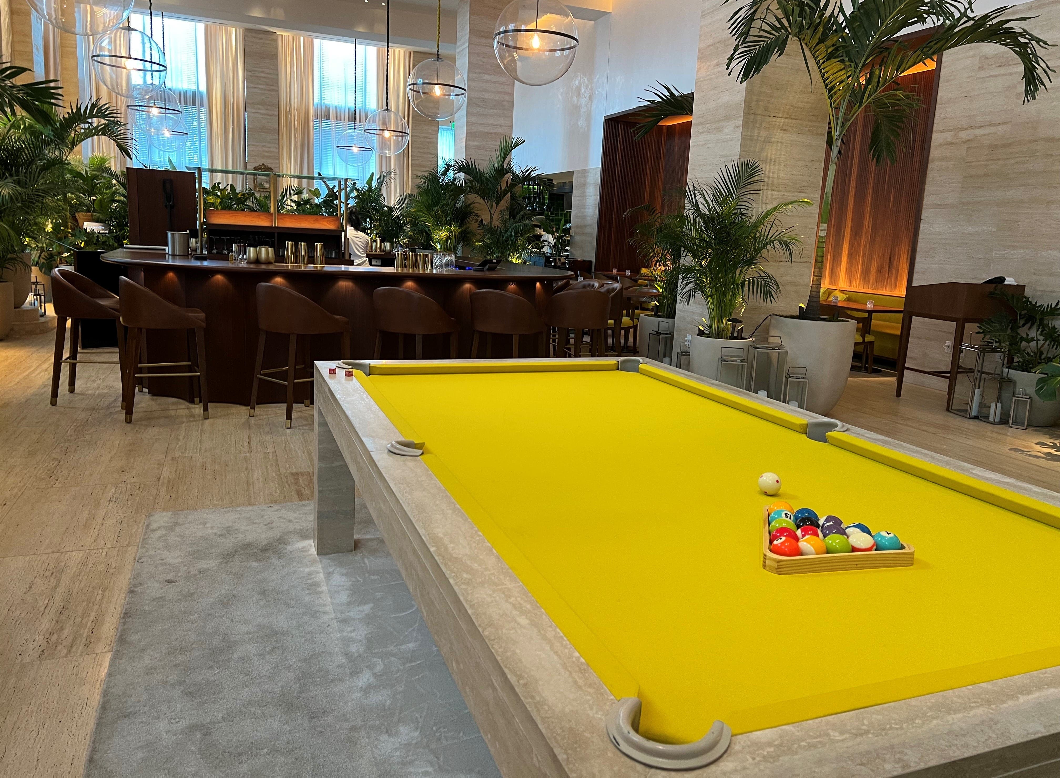 The lobby bar area features a fun yellow pool table and cozy seating.