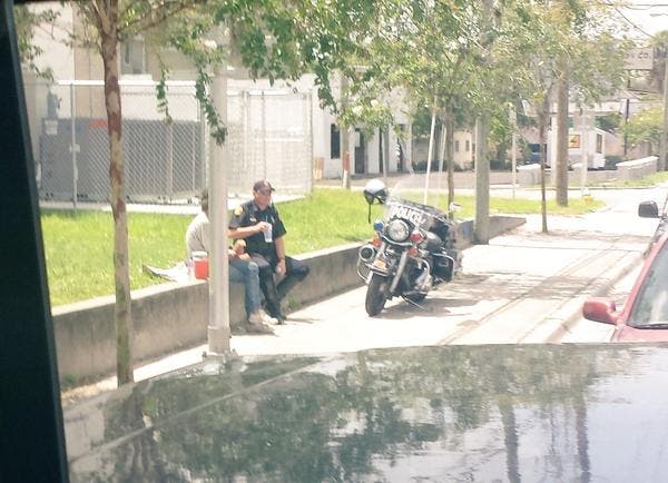 The officer was out on patrol Wednesday when he decided to pull over to the side of the road and share lunch and conversation with a homeless man. The scene unfolded on the corner of Hillsborough and Florida avenues around lunchtime.