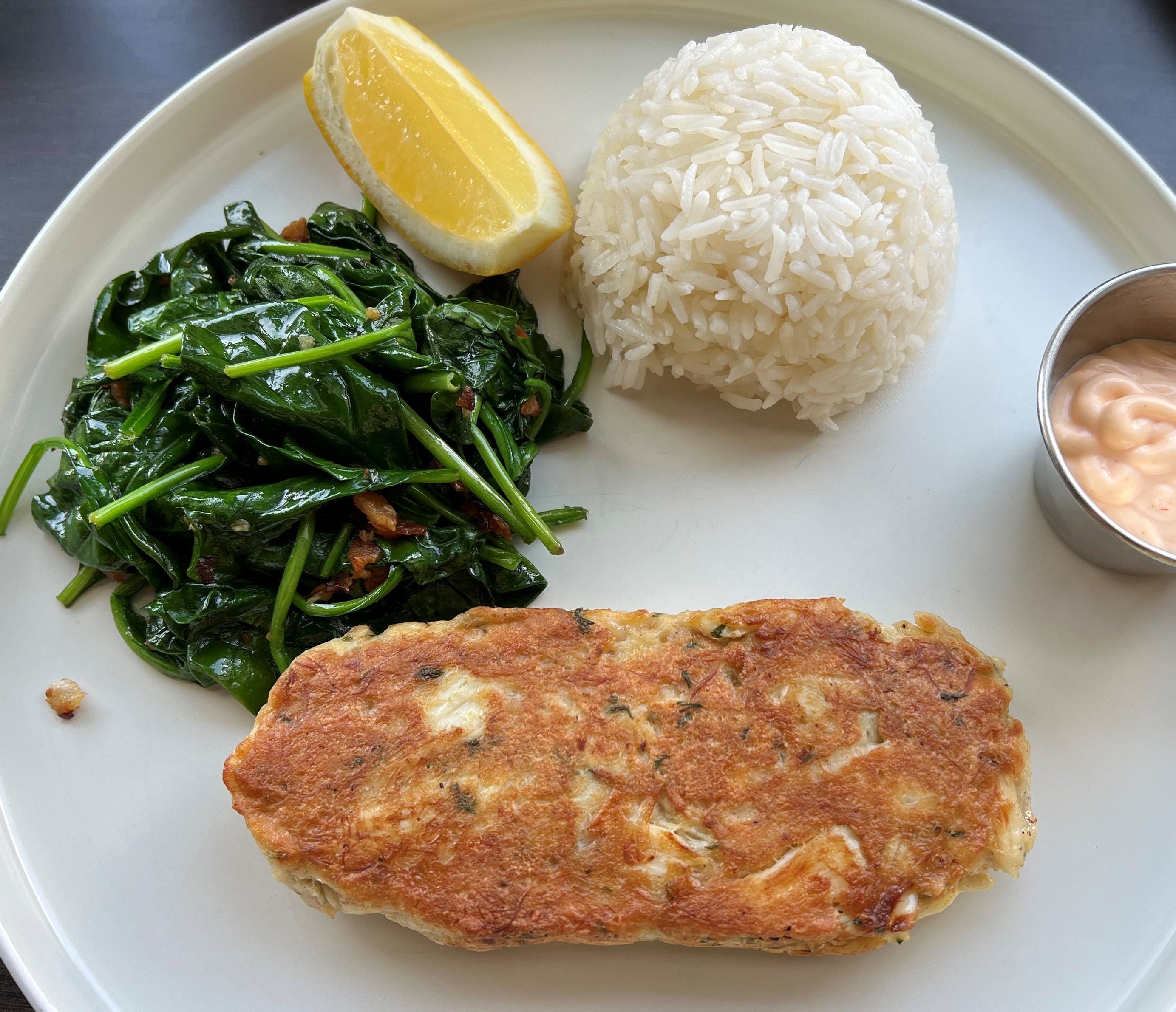 I am happy to report Paul's version is simple. Well-seasoned quality lump crab meat seared to golden brown with a squeeze of fresh lemon to brighten and served with a creamy dipping sauce to beautifully round out the flavors and textures. The vibrant spinach is an optional side dish I highly recommend if not included with your dish.