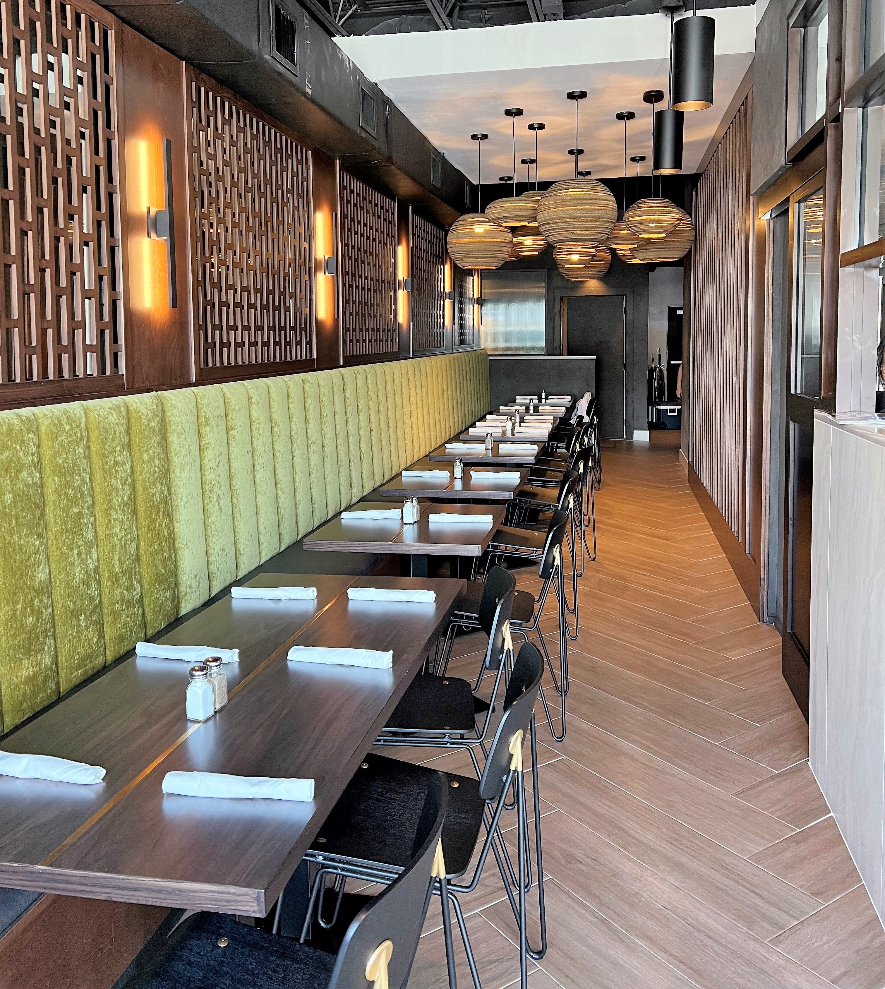 The simple dining room makes the most of the 30-seat vertical space and strip mall setting.