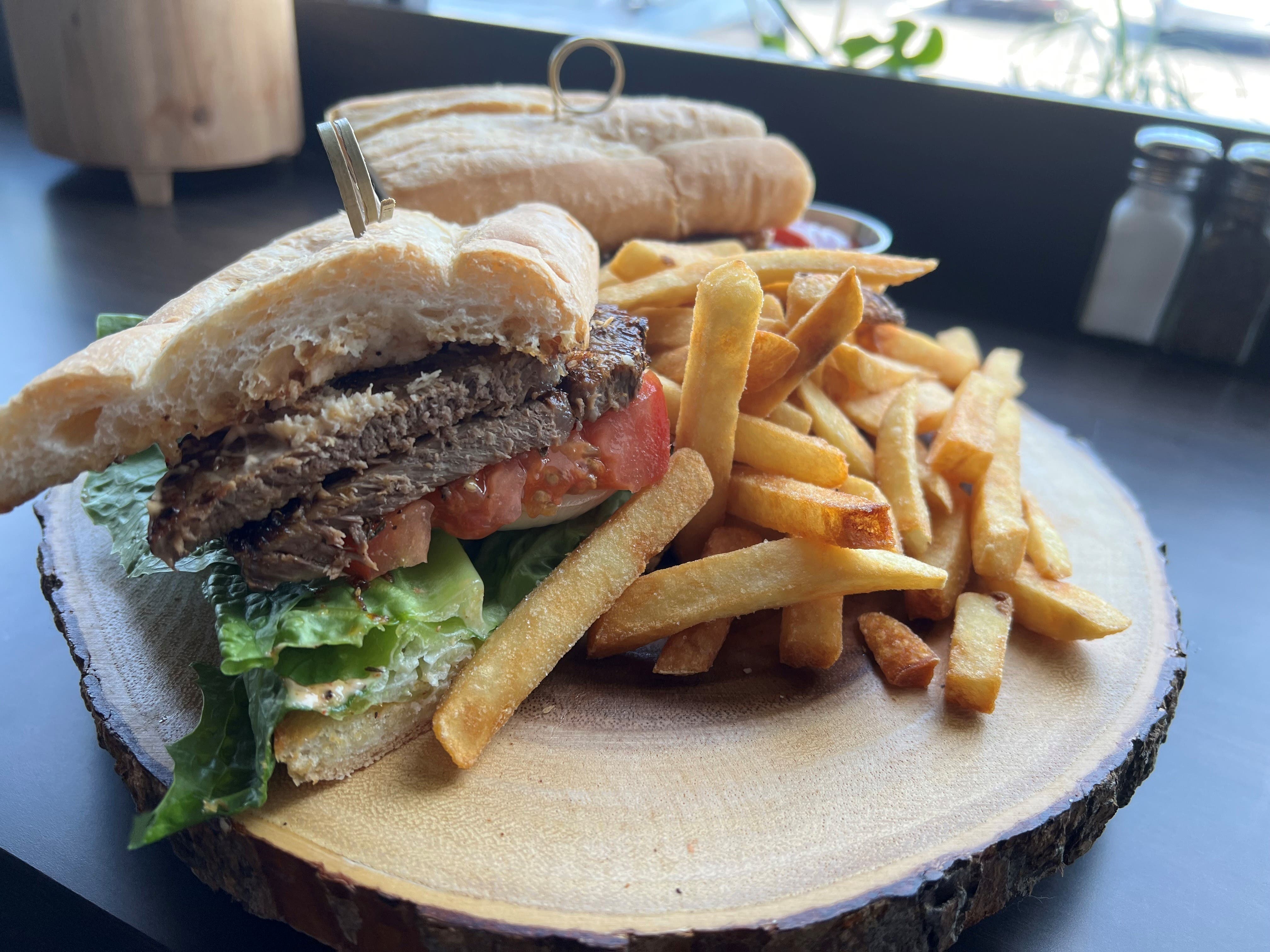 Blackened Prime Rib Sandwich: Thinly sliced prime rib on French bread with horseradish, romaine lettuce, onion, tomato. I could make four meals out of this beautiful sandwich.