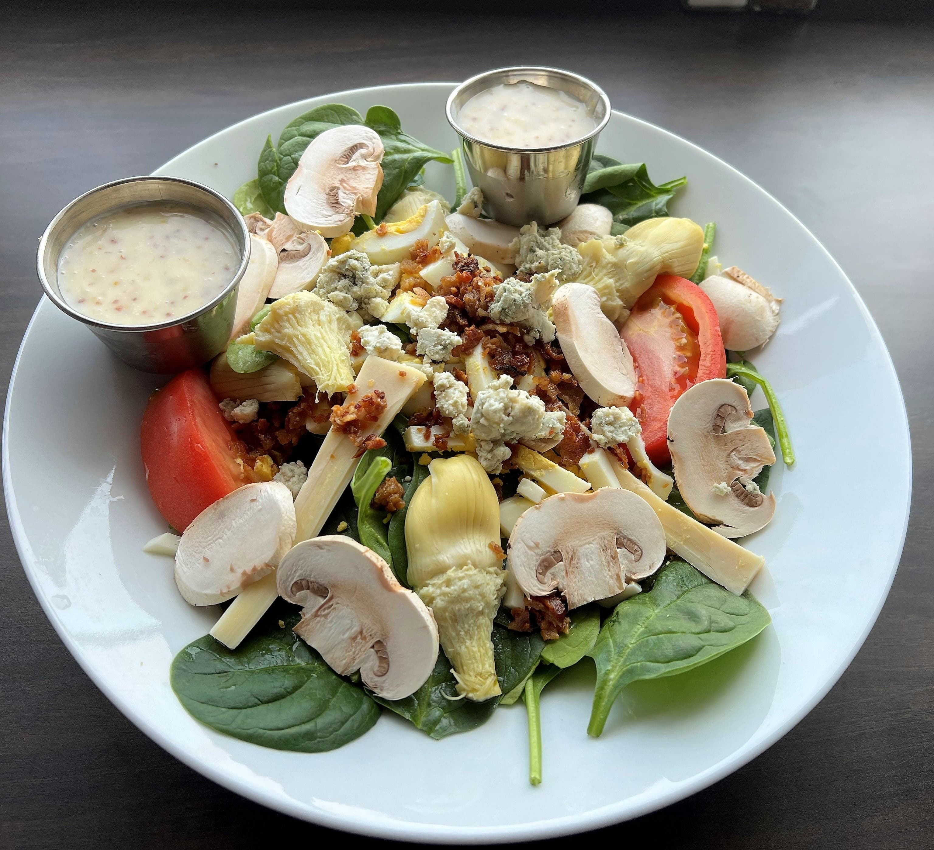 Spinach salad: Spinach, bacon, artichokes, egg, tomato and blue cheese with poppy seed dressing. Again, freshness reigns and each element top quality.