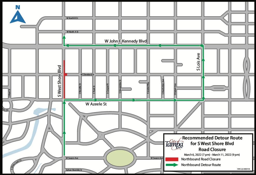 The northbound lane of West Shore Boulevard between West Kennedy Boulevard and West Azeele Street will be closed through Friday at 9 p.m.