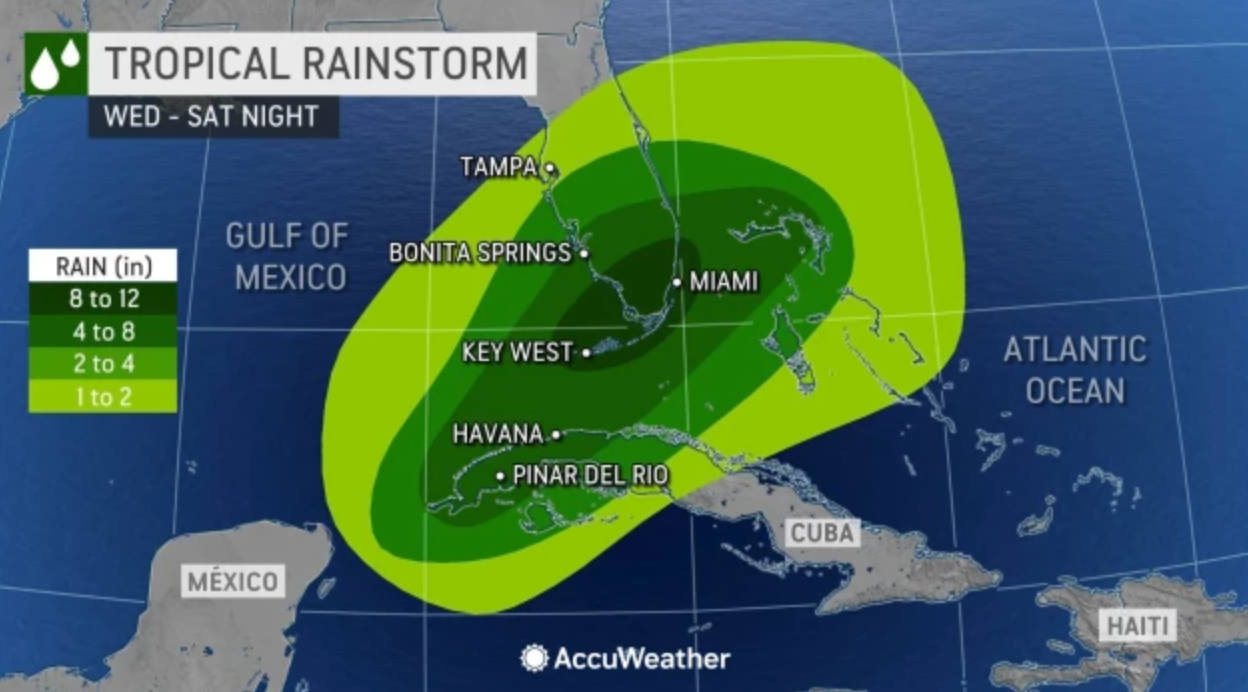 AccuWeather.com meteorologists are reporting a nearly identical assessment of the storm, saying 8 to 12 inches of rainfall is possible from the Florida Keys to the Everglades and the Miami area on Saturday night.