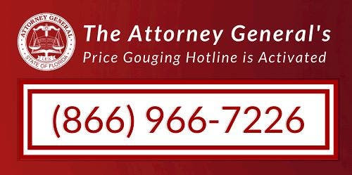 Price gouging can also be reported online at MyFloridaLegal.com or by calling 1(866) 9NO-SCAM (1-866-966-7226).