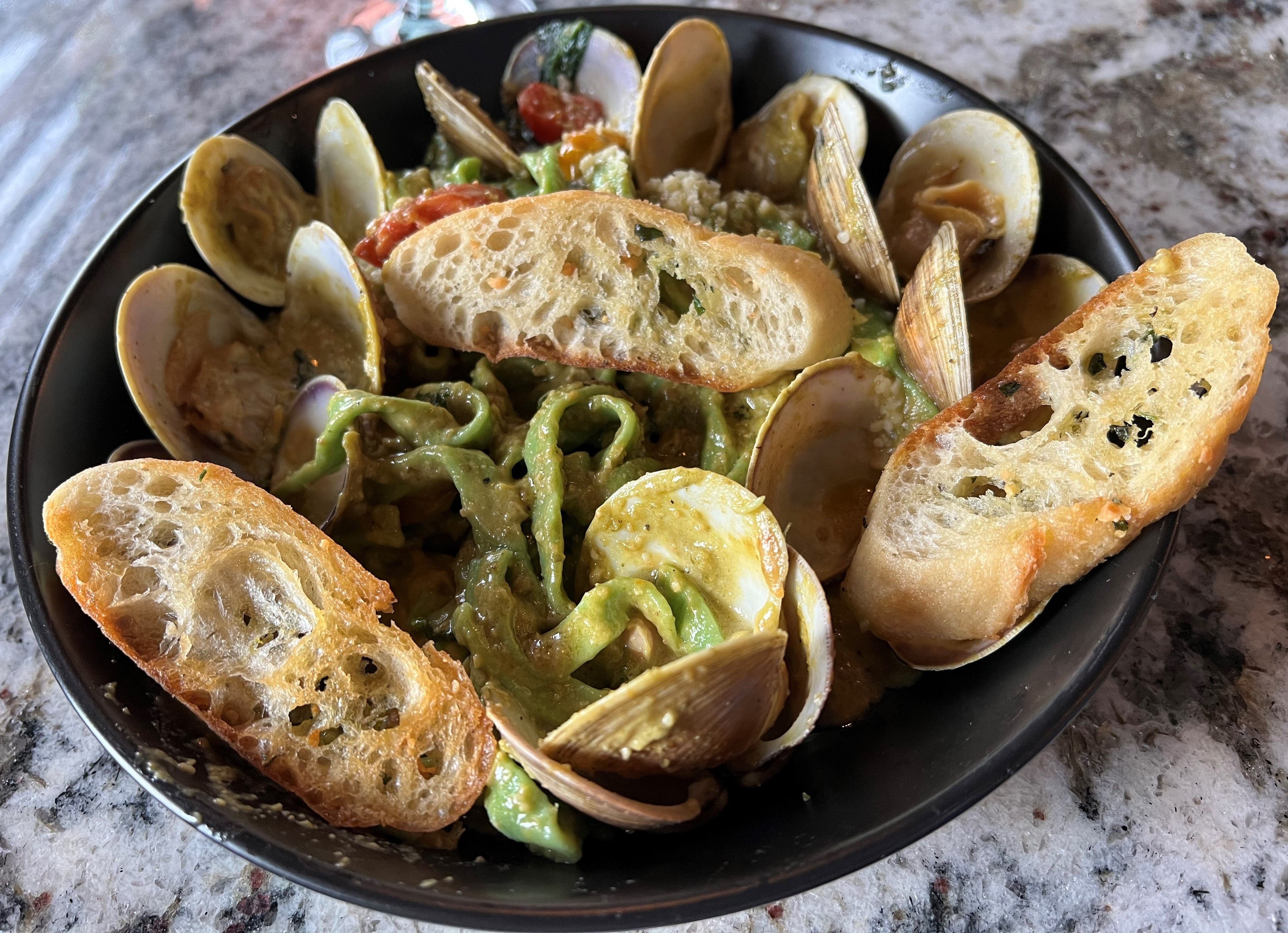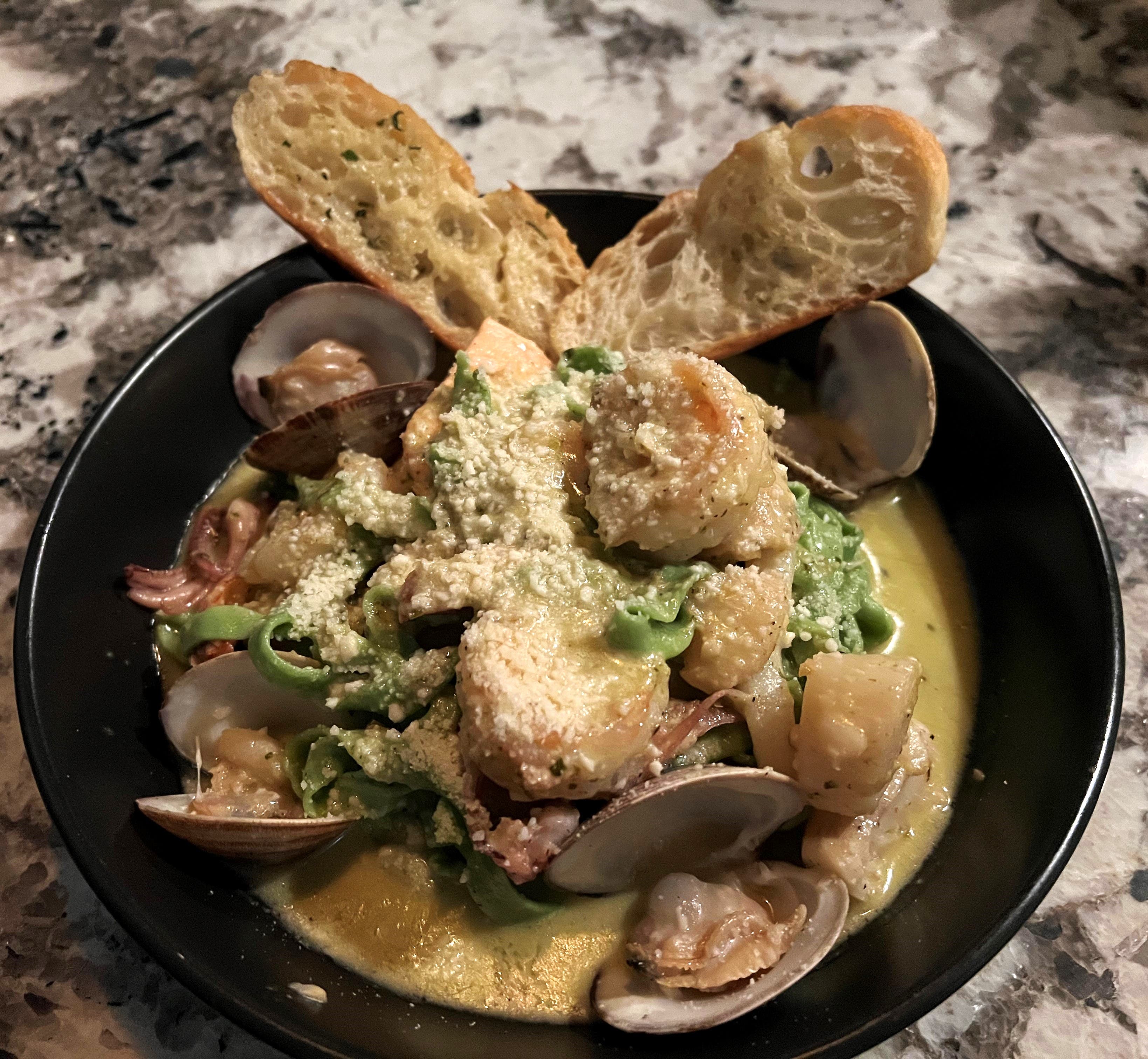 The seafood pasta was my favorite dish. It is full of fresh delicious seafood with pasta with just the right bite. It contains shrimp, scallops, calamari, mussels and clams, tossed in a homemade spinach de fettuccini and creamy roasted poblano pepper sauce