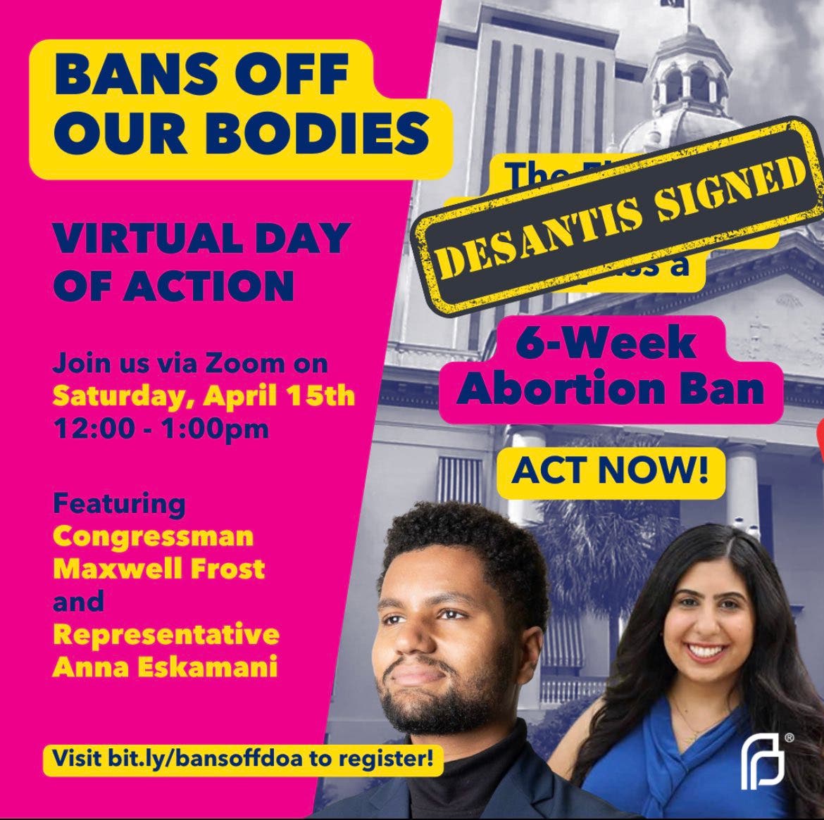 Florida Planned Parenthood Action will host a "virtual day of action" via Zoom Saturday from noon to 1 p.m., featuring U.S. Rep. Maxwell Frost, a Democrat representing District 10 in central Florida, including Orlando, and Florida Rep. Rep. Anna Eskamani, D-Orlando.