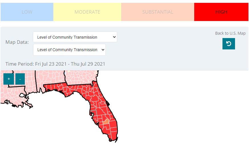 In Florida, 66 of 67 counties are listed as having "high" levels of community transmission of the coronavirus. Glades County is the only Florida county that's listed as having a "substantial" level of community transmission.