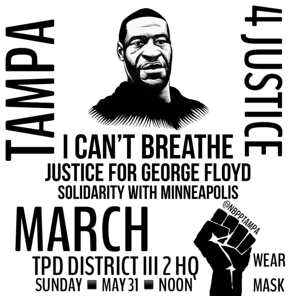 Also rallying this weekend is the Tampa Bay chapter of the New Black Panther Party for Self-Defense. Using the quote Floyd uttered with his dying breath, the New Black Panther Party is planning the "I Canât Breathe" Justice for George Floyd Solidarity March on Sunday at noon outside the Tampa Police District 3 Station, 3808 N. 22nd St., Tampa.