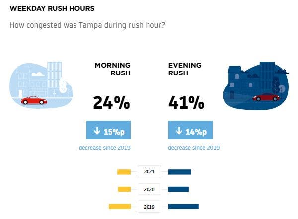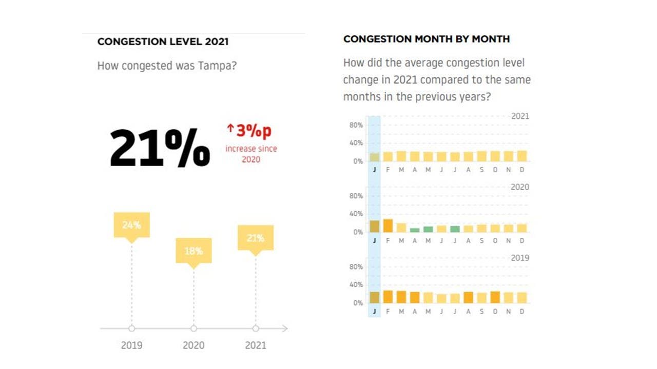In 2021, the congestion level in Tampa increased 21 percent, meaning it took 21 percent longer to reach a destination in Tampa, a 3 percent increase over 2020.