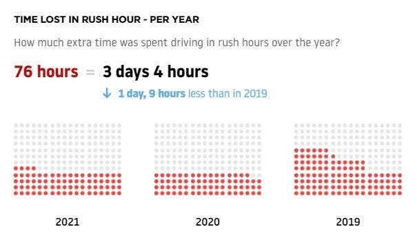 And the time it took to commute during rush hour decreased significantly since 2019 when commuters spent 76 hours, or three days and four hours a year, stuck in rush-hour traffic.