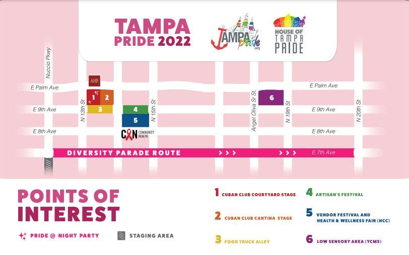 The Tampa Pride Diversity Parade will kick off at 4 p.m. and will wind its way east from the corner of Nuccio Parkway and East 7th Avenue, with floats, marching bands, decorated cars and other participants. It will continue down East 7th Avenue to North 20th Street.