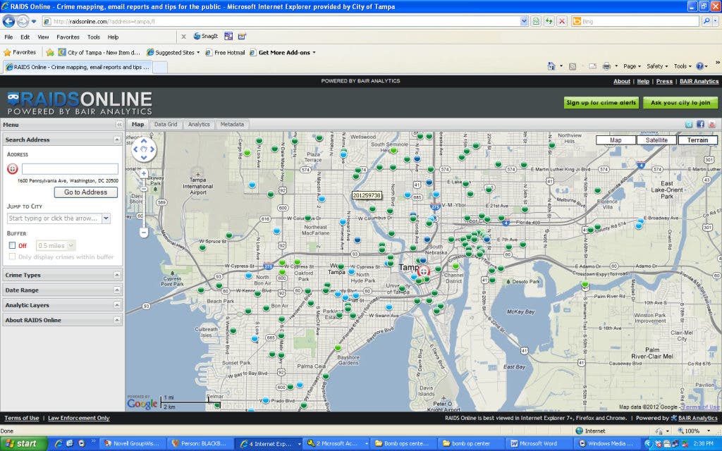 The Tampa Police Department has teamed up with RAIDS Online to provide easy to read crime maps and analysis to allow Tampa residents a first-hand look at crimes in our city. RAIDS Online displays crime data to the public using Google Maps' well-known mapping interface. All the user has to do is type in their address, select the date and crimes they'd like to monitor and the information is provided on the map.