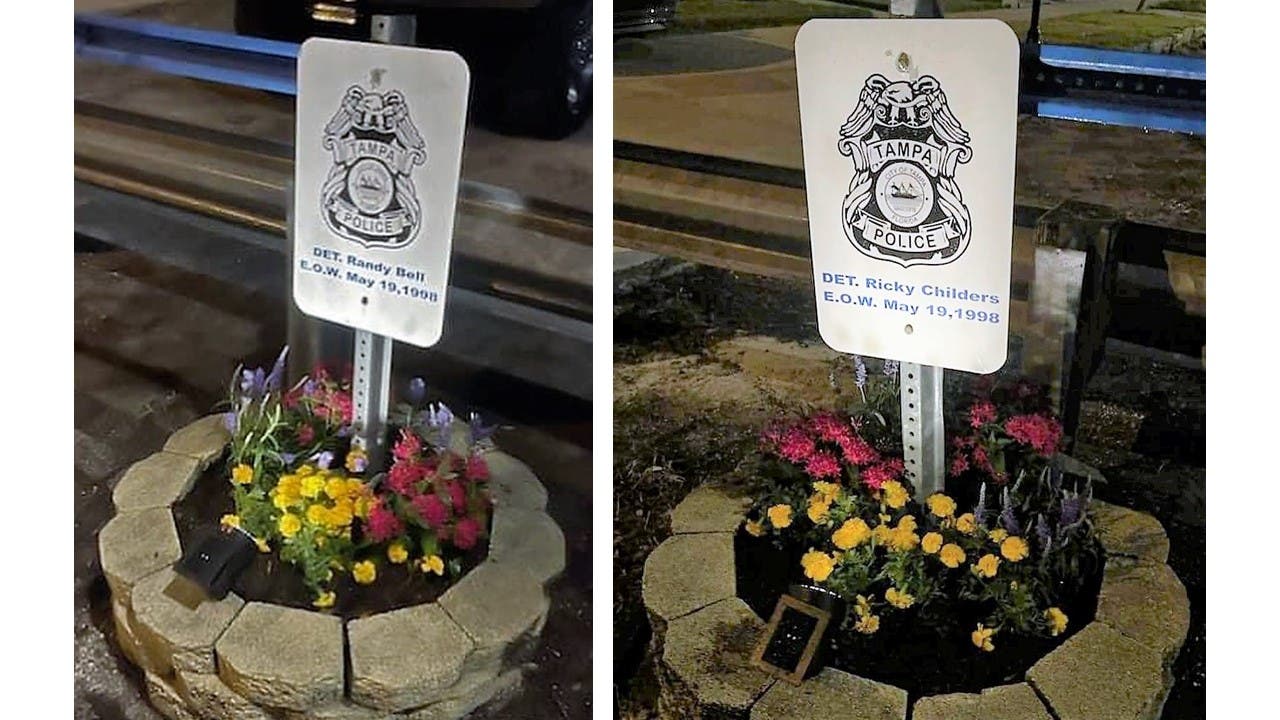 Every year on the anniversary of the deaths of the two detectives, Tampa residents Robin Sarrasin and Marcus Peworchik replant flowers around their memorials.