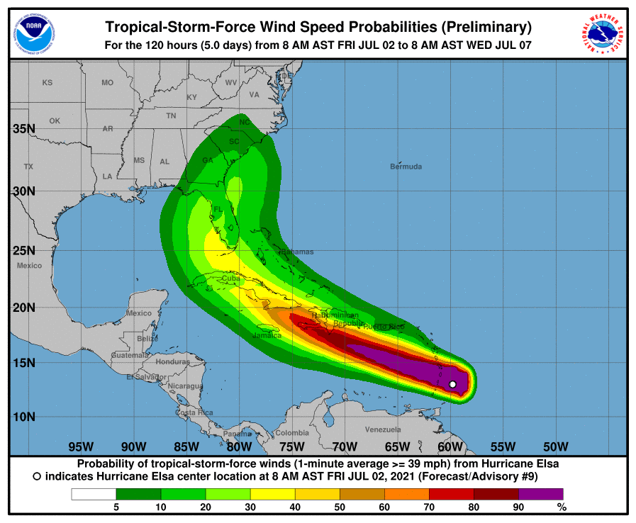 Elsa is forecast to move away from the Windward Islands during the next several hours, passing across the eastern Caribbean Sea and the southern coast of Hispaniola late Saturday. By Sunday, Elsa is forecast to move near Jamaica and portions of eastern Cuba, impacting central and western Cuba Sunday night and early Monday where winds may decrease somewhat as Elsa interacts with Cuba's land mass.