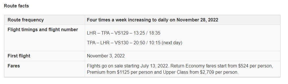 Virgin Atlantic announced new year-round service from Tampa to London with plans to initially fly four times a week, then daily on Nov. 28.