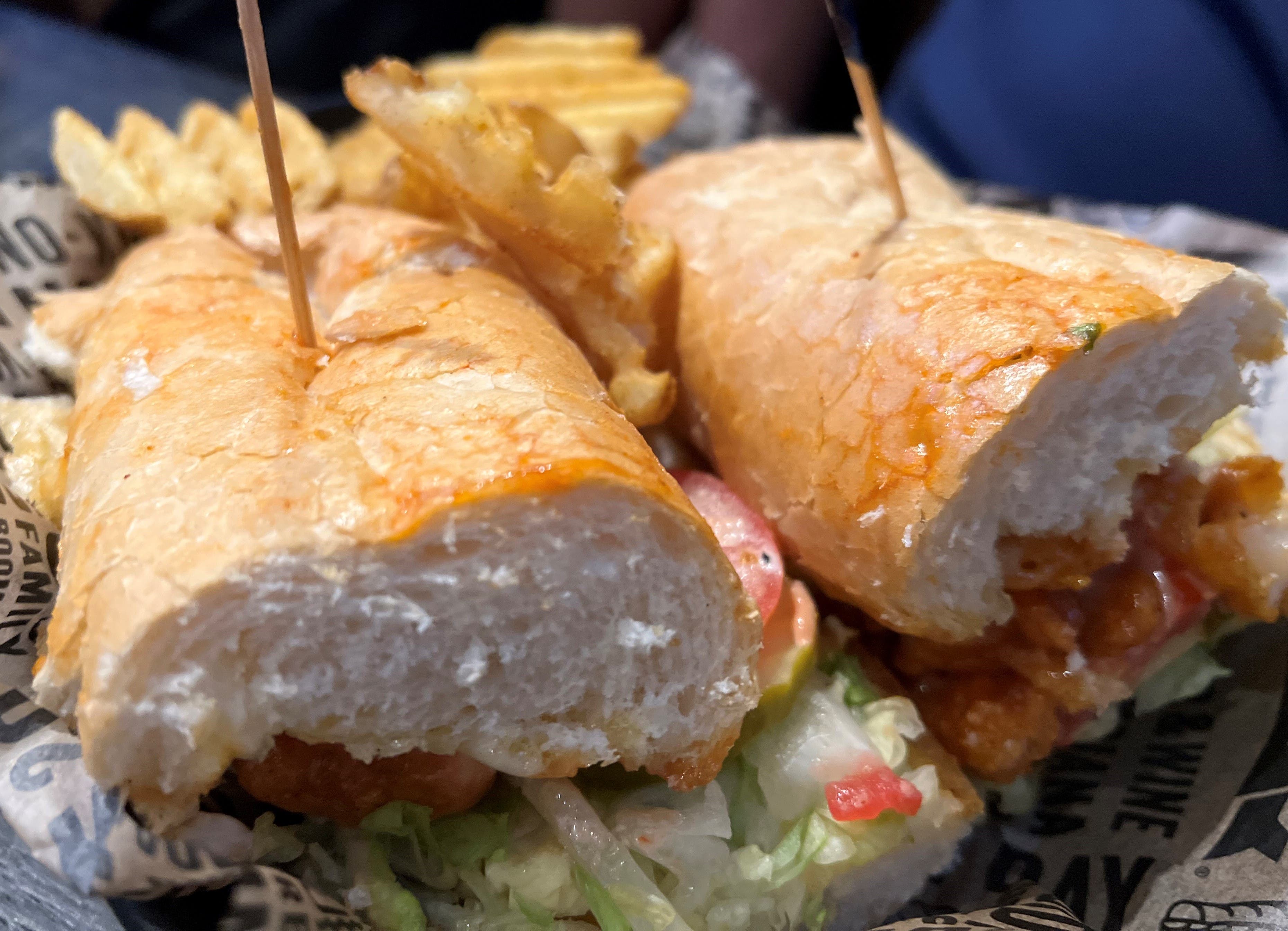 The Shrimp Poboy is dressed with lettuce, tomatoes, mayo and pickles.