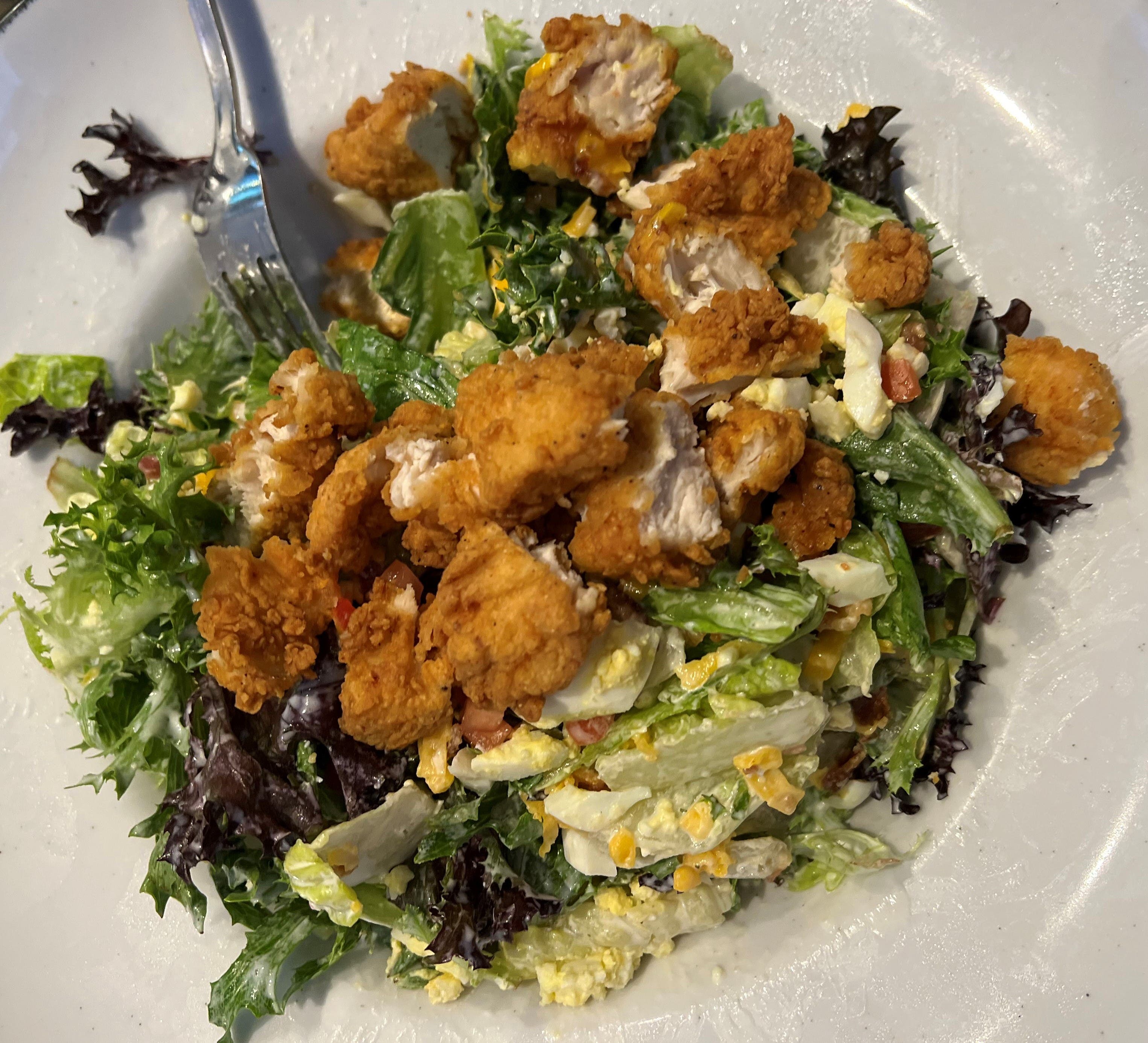 The Cypress Cobb Salad includes fried chicken, mixed greens, bacon, avocado, egg, tomatoes, bleu cheese and ranch dressing.
