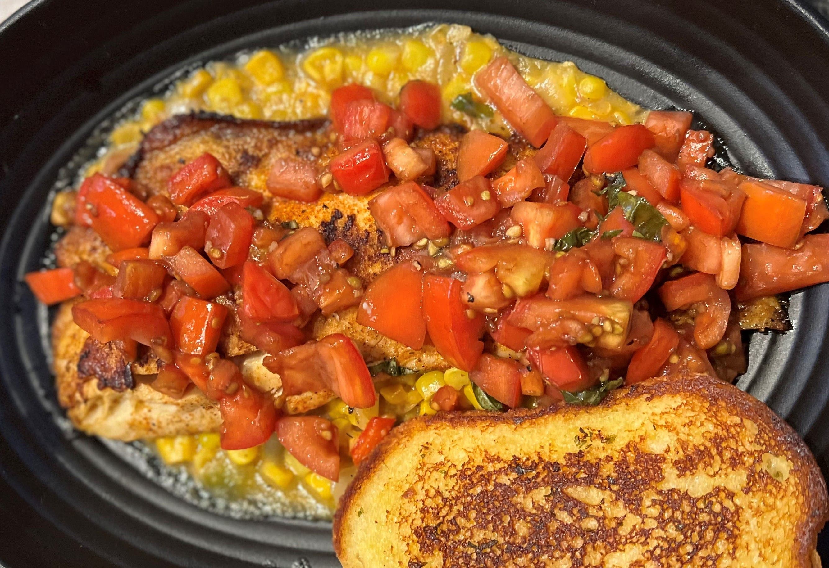 Redfish Rudy is blackened redfish, warm tomato salsa, served with Louisiana street corn.