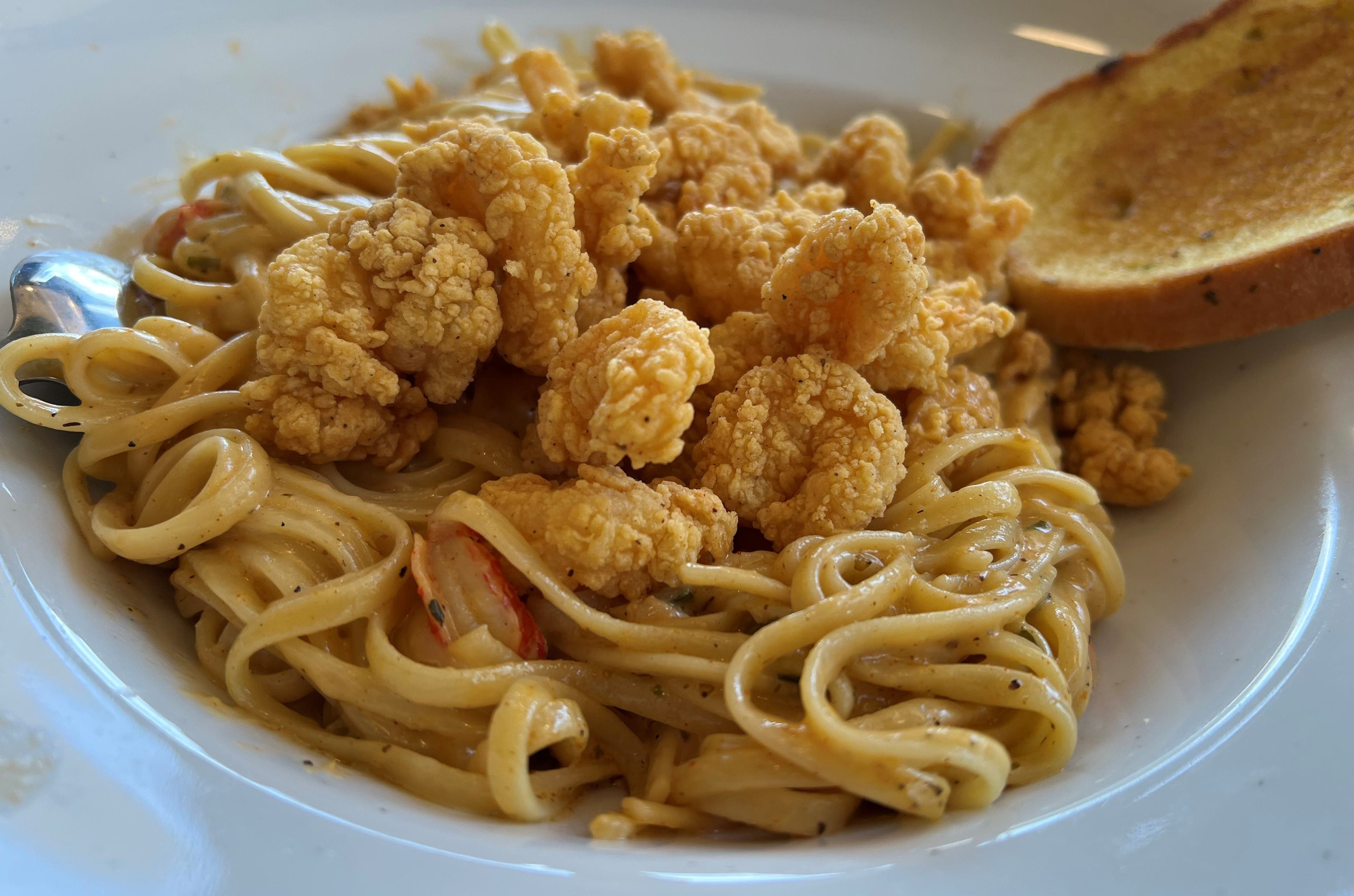 Bayou Pasta features fried shrimp and crawfish cream sauce over linguine.