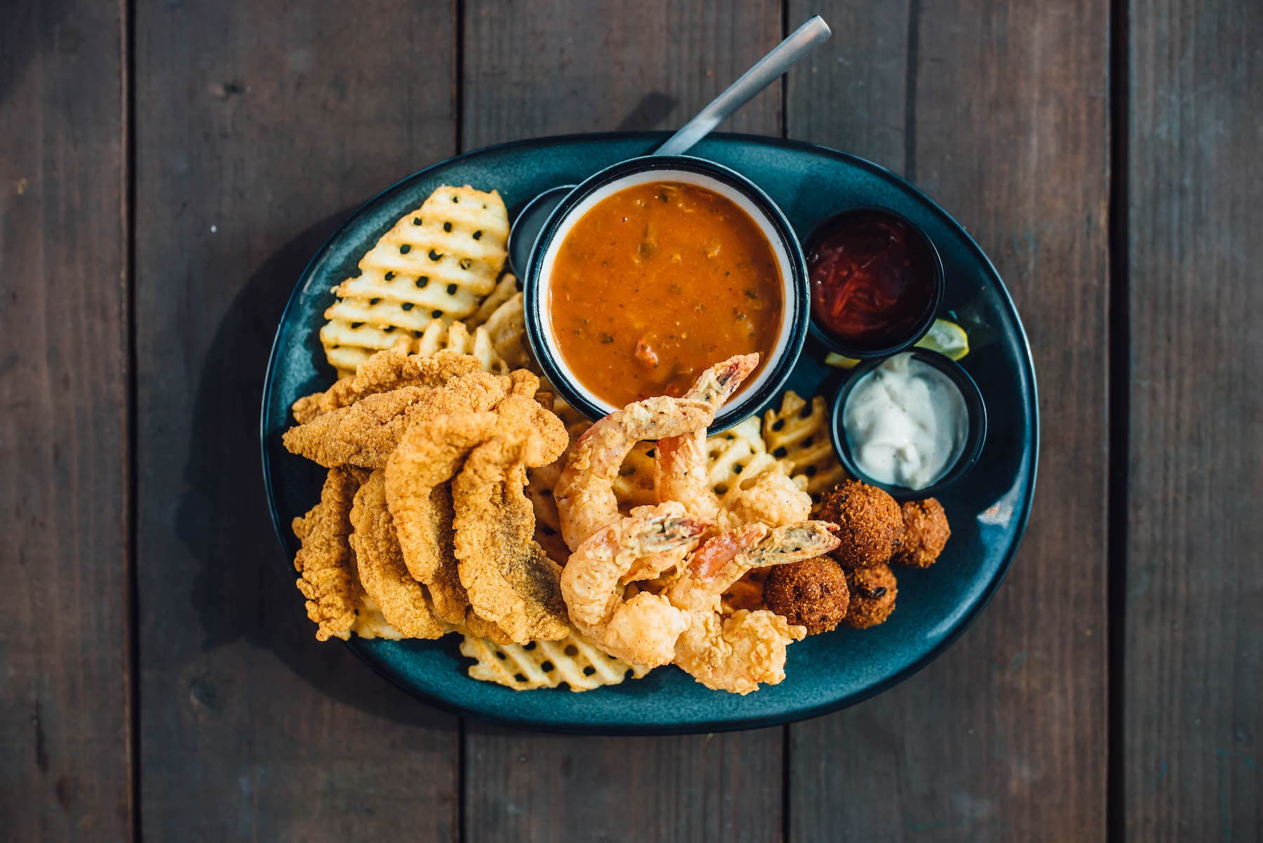 Walk-On's Bistreaux & Bar Louisiana Combo includes fried shrimp, fried catfish, hush puppies, crawfish étoufée and a side of fries.