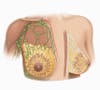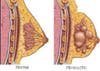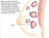 During this process, the fragments of broken cells and the inflammation may lead to scarring (fibrosis) that damages the ducts and the clusters (lobules) of glandular tissue within the breast. The inflammatory cells and some of the breakdown fragments may release hormone-like substances that in turn act on the nearby glandular, ductal, and structural support cells.