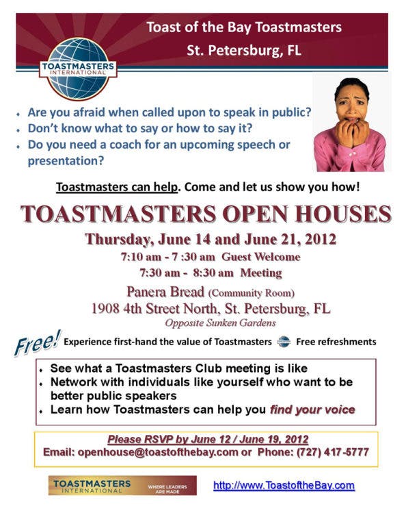 Our Open Houses give you the opportunity to experience a Toastmasters meeting first-hand, to learn how Toastmasters can benefit you personally and professionally.