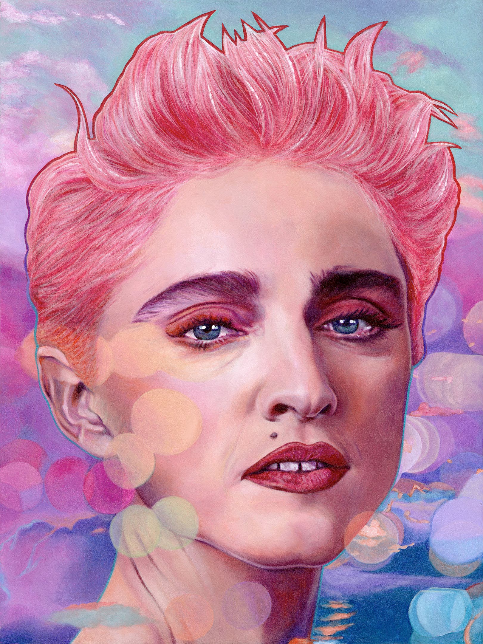 "Our Lady of Divine Light," by artist Johannah O'Donnell of Sarasota features Madonna with pink, short-hair and blue eyes with clouds above.