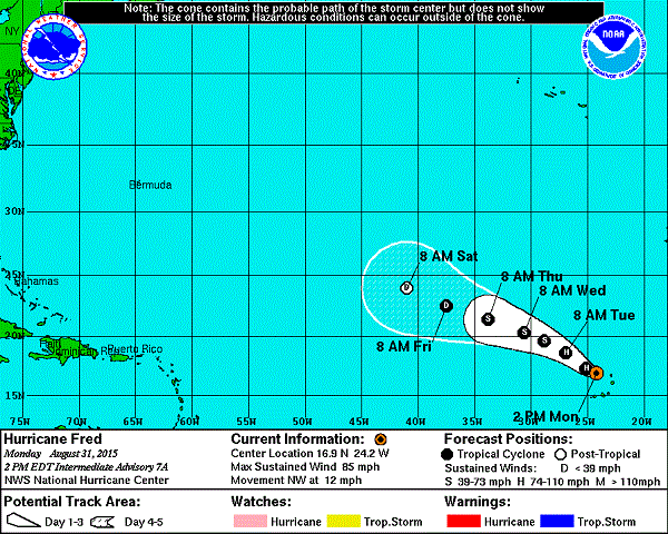 Fred is officially the second hurricane of the 2015 Atlantic season, but he’s not likely to pay the United States a visit anytime soon.