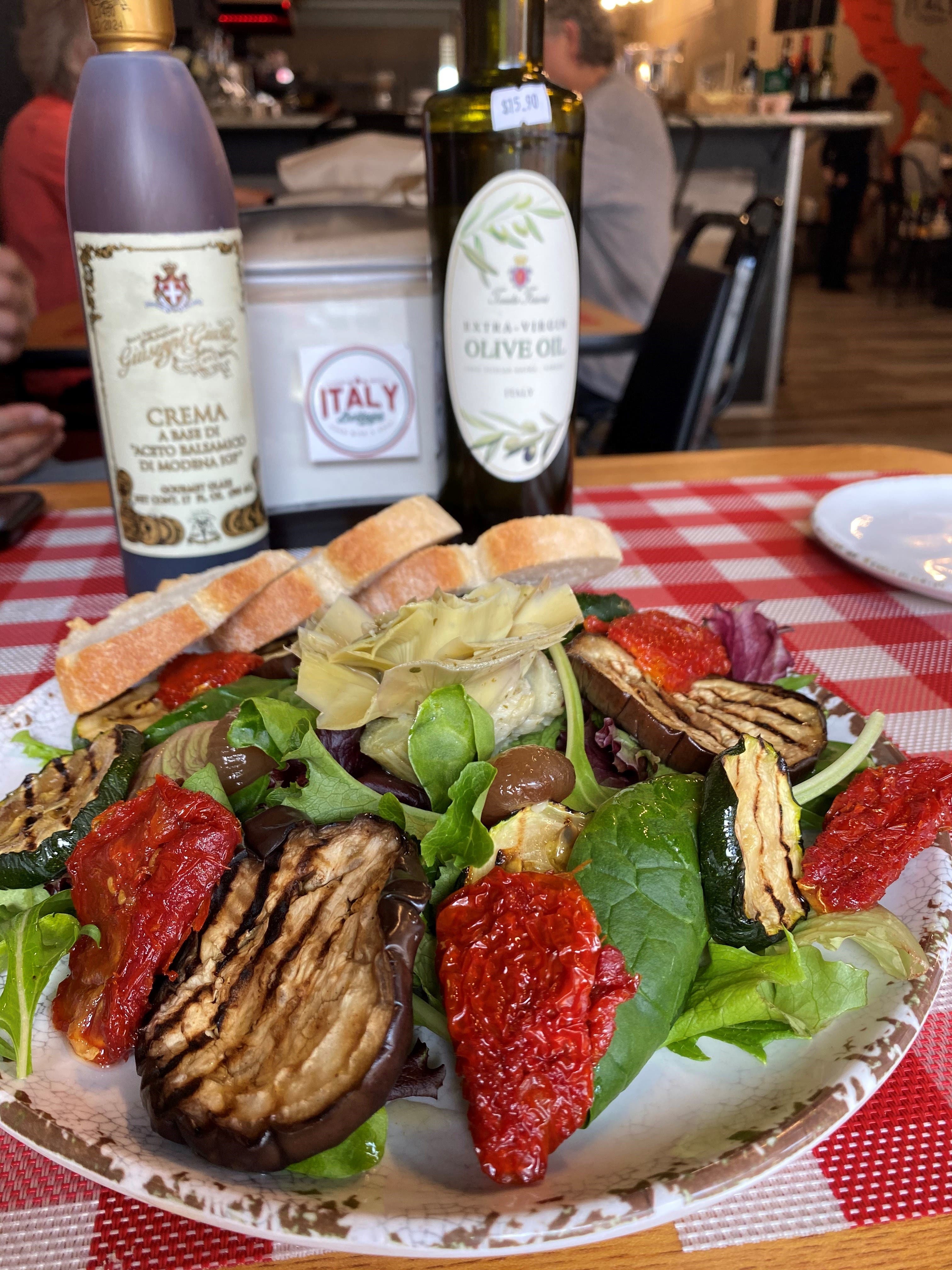 Vegetarian salad- spring mix, grilled zucchini, grilled eggplant, dried tomato, marinated onions with balsamic vinegar.