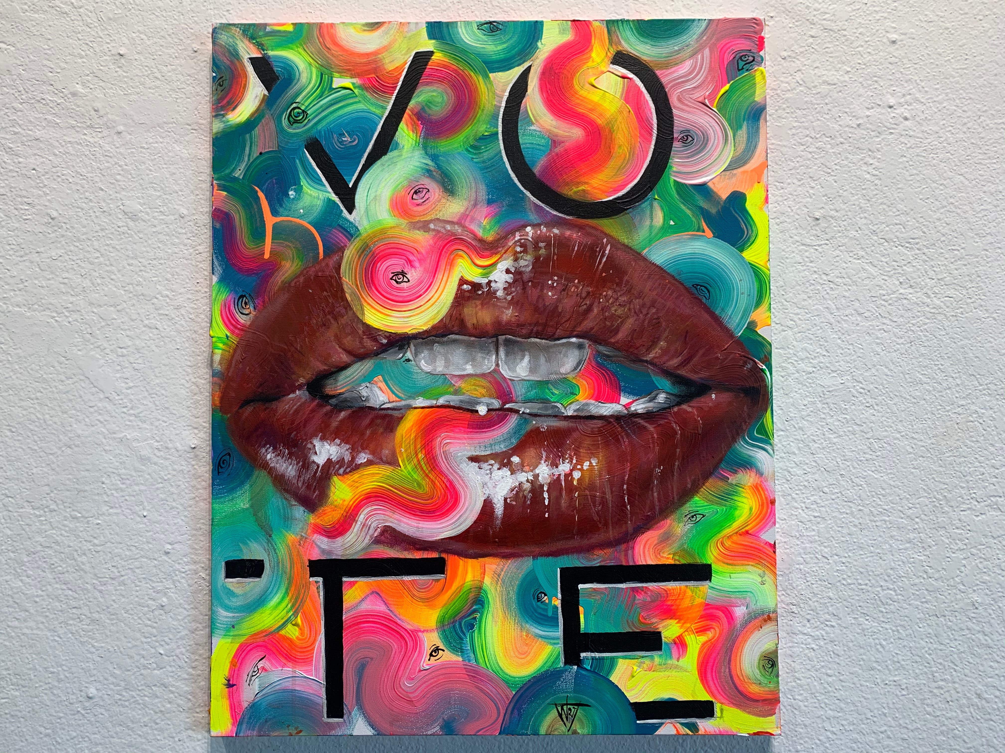 Nikita Rosalind, a local St. Pete artist, makes voting look sexy and vibrant with her piece that features parted full lips with teeth slightly showing surrounded by the word, "Vote" accompanied by bright dripping colors. "Louder" is the title of Rosalind's piece.