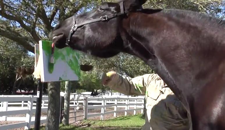 “He likes to grab things with his mouth,” Hughes explained on a video released by the department. That got him to thinking, “I bet if I give him a paint brush and put a canvas in front of him he’d paint on it.”