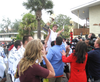 Out at 9am rain started lightly and cold, the winds was knocking chairs in the water, with help from the local police, fishing them out with a pole. Many came early and stood waiting for the Epiphany Celebration of the cross divers and blessings.Β The Manatees swam slowly like playing tag with divers. 20-30 people took their spots and hunker down.Β I came back at 12 noon the crowd overflow to the streets and wet grass waiting soon for the Cross Divers.Β Here they come, brave souls.Β 2 boat tip and sank leaving about 9 boys in the water, and finally the cross is thrown into the water, and a winner emerges. All shivering, but honored to be in the celebration.Β Only one can win, Retriever is Peter Tommy Smith of Ellenton, I finally found his name but it seems some reporters have confusion so anyone feel free to correct me, I want the honor to go to the correct young man.Β Who is now probably finally warm with the knowledge of his blessings and family and away from the cold water of the bayou.