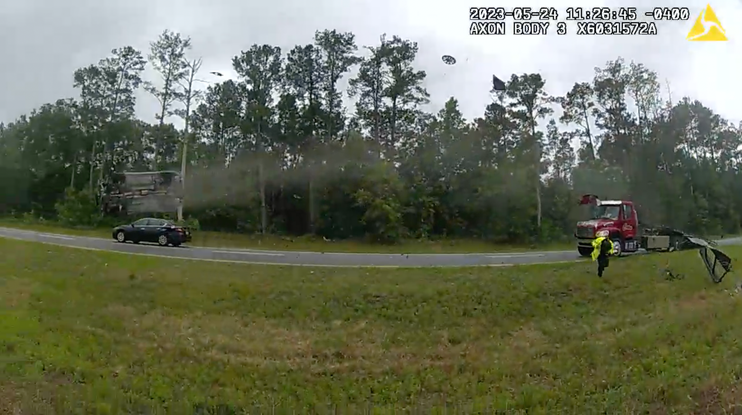 VALDOSTA, GA — A heart-stopping moment caught on a police body camera shows a sedan driving up the ramp of a tow truck and rocketing into the air in the middle of a Georgia highway last week.