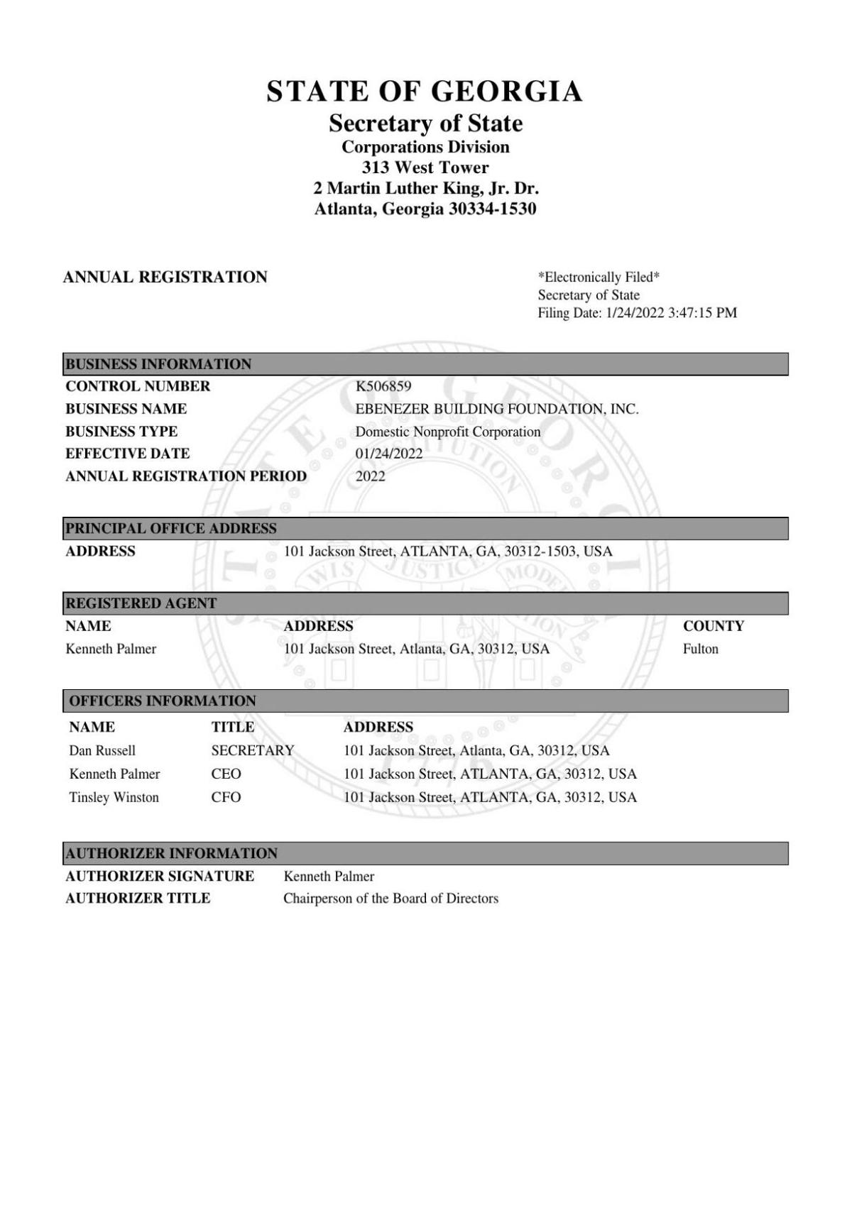 The foundation's address is listed at the same address as Ebenezer Baptist Church, where U.S. Sen. Raphael Warnock, D-Georgia, is the senior pastor.