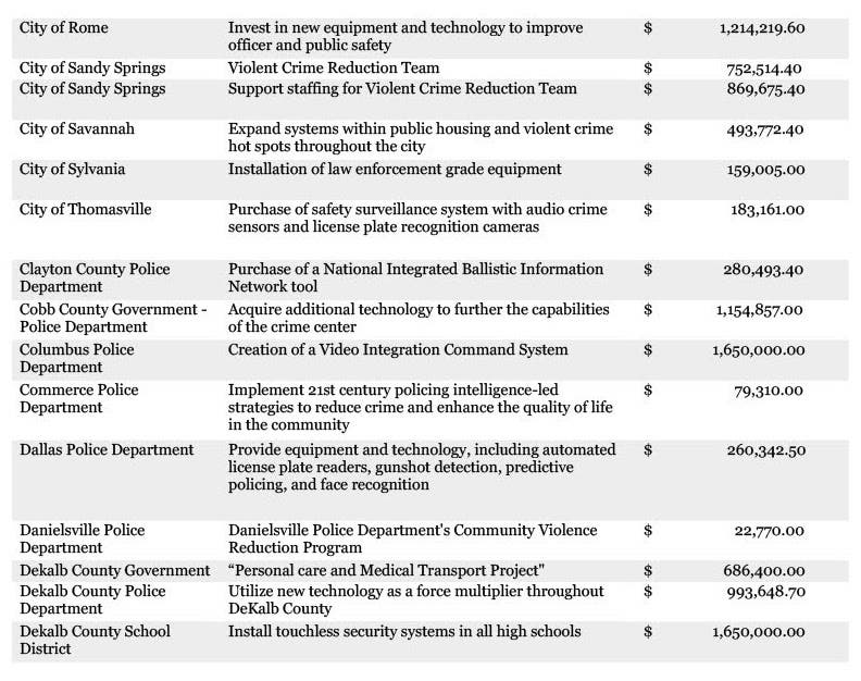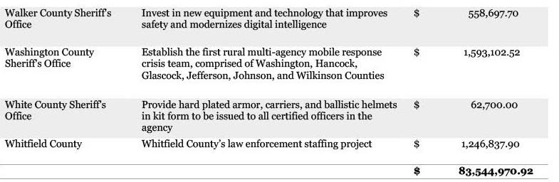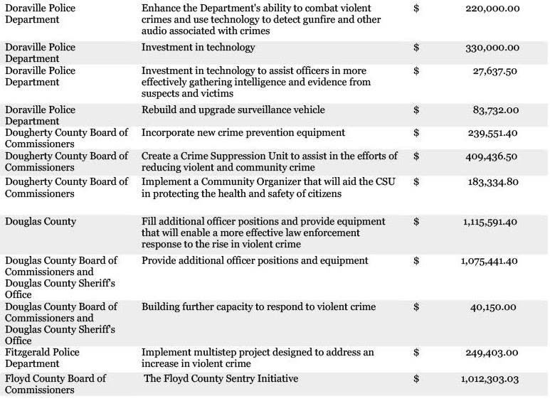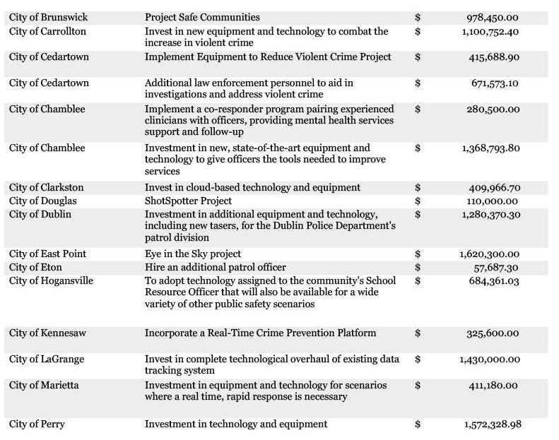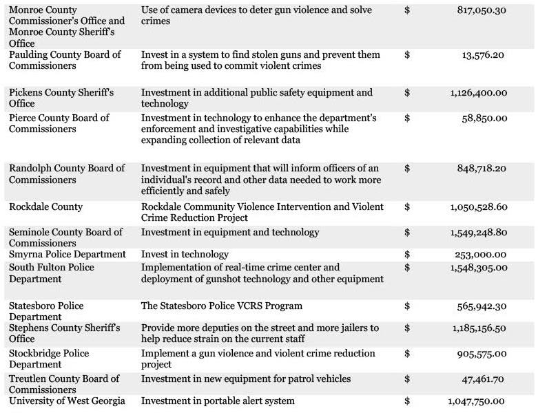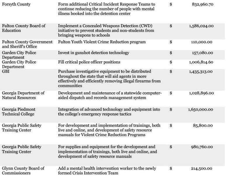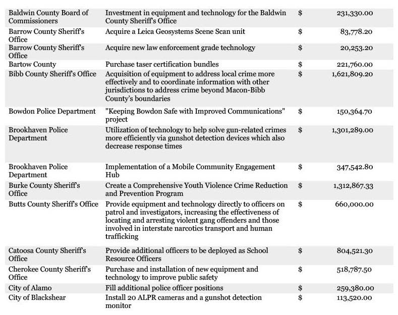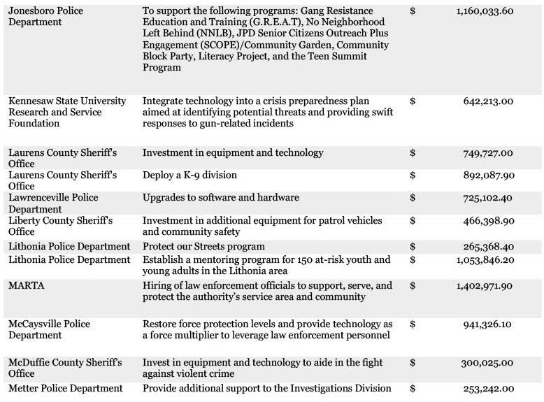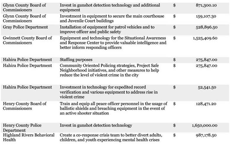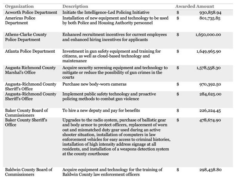 The funding will benefit 87 Georgia public safety agencies, school districts, counties and cities, including: