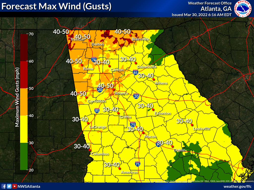 A wind advisory is in effect from 11 a.m. Wednesday to 8 a.m. Thursday for much of north and central Georgia.