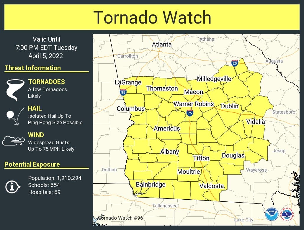 A tornado watch has also been issued for parts of Georgia until 7 p.m. Tuesday, mostly south of Macon.