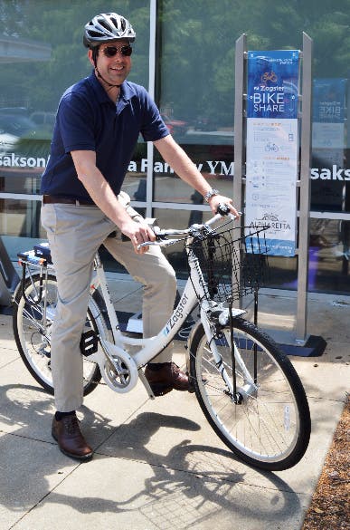 Photo: City Councilman Jason Binder tests the Alpharetta Bike Share Program. Credit: city of Alpharetta