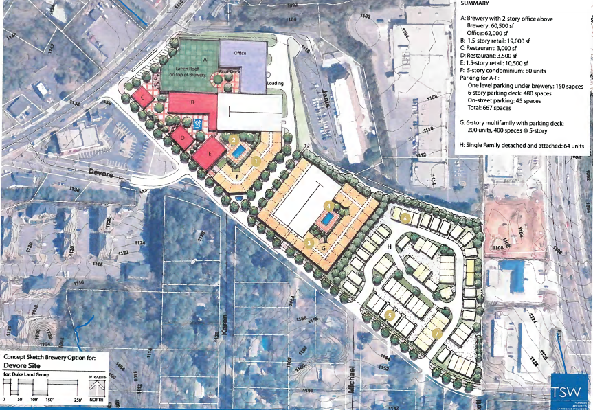 The site is is situated along South Main Street near Devore Road. According to a rendering provided by the company, the development could feature a 60,500-square-foot brewery below two stories of office space; 29,500 square feet of retail space, 6,500 square feet of restaurant space, 80 condominium units, a six-story parking deck, a six-story multi-family building with 200 units and 64 single family detached homes.