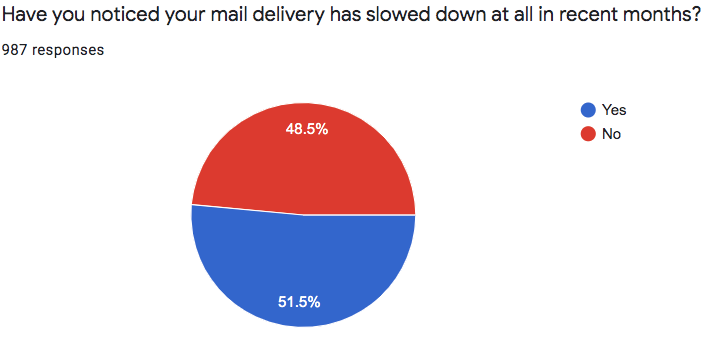 Slightly more than half of those filling out the survey said they've noticed mail delivery delays, something Congress is holding hearings on.
