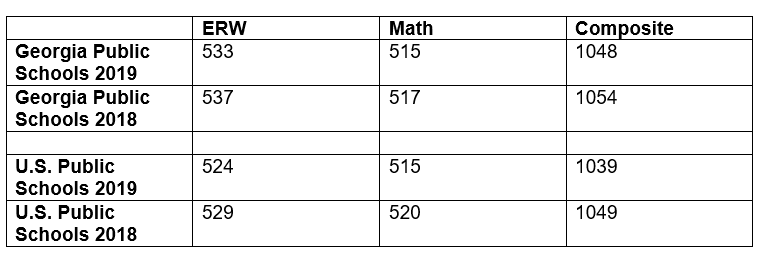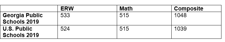 Georgia outperformed the nation’s public schools by nine points in Evidence-Based Reading and Writing (ERW) and performed on par with their national counterparts in math.