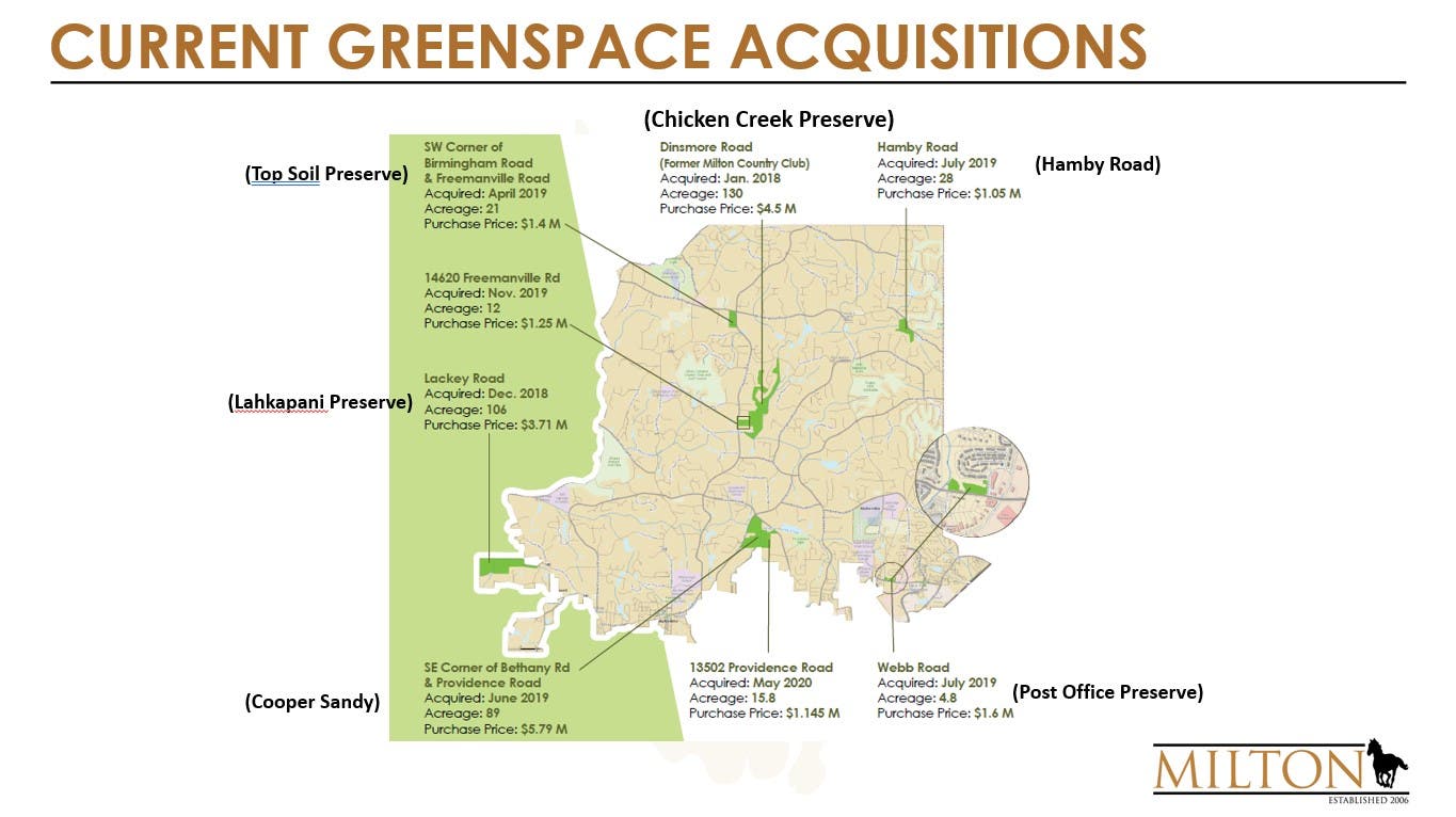 The City of Milton has purchased for $20 million eight green space areas totaling more than 400 acres, but none are named yet.