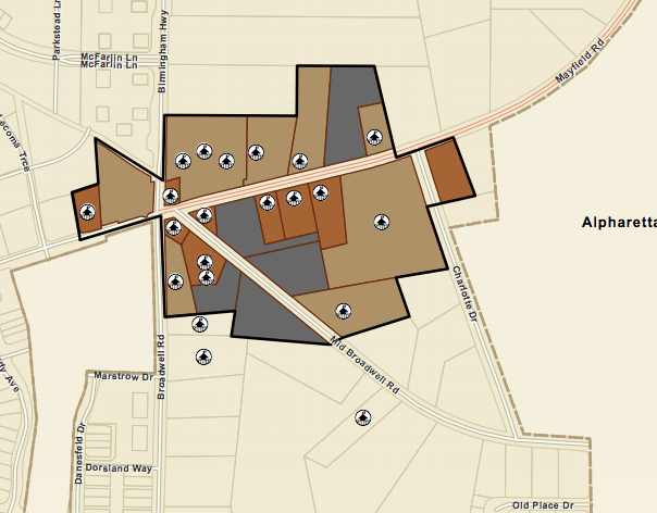 The 23 parcels — situated on 25.170 acres — are located along Crabapple and Mayfield roads between Broadwell Road/Birmingham Highway and Charlotte Drive. It also includes 20 areas that have been designated as historic sites.
