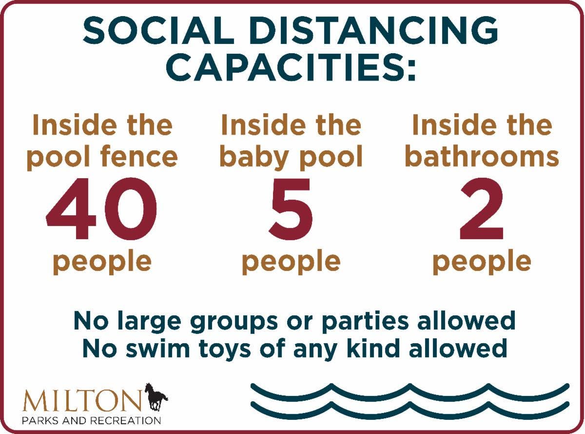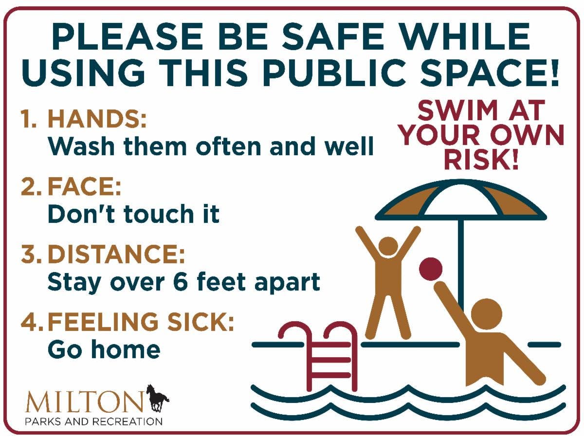 For starters, the city will take several steps aimed at curbing COVID-19. While this coronavirus isn't believed to be contagious in chlorinated water, it can spread through the air, touched surfaces and on contact. To prevent that, there will be enhanced cleaning at the pool, furniture may be shifted to encourage social distancing, and signs (like the two shown below) will be posted around the deck. In addition, the city has devised special, additional rules for pool visitors related to COVID-19. Review those rules here on the Milton City Pool website.