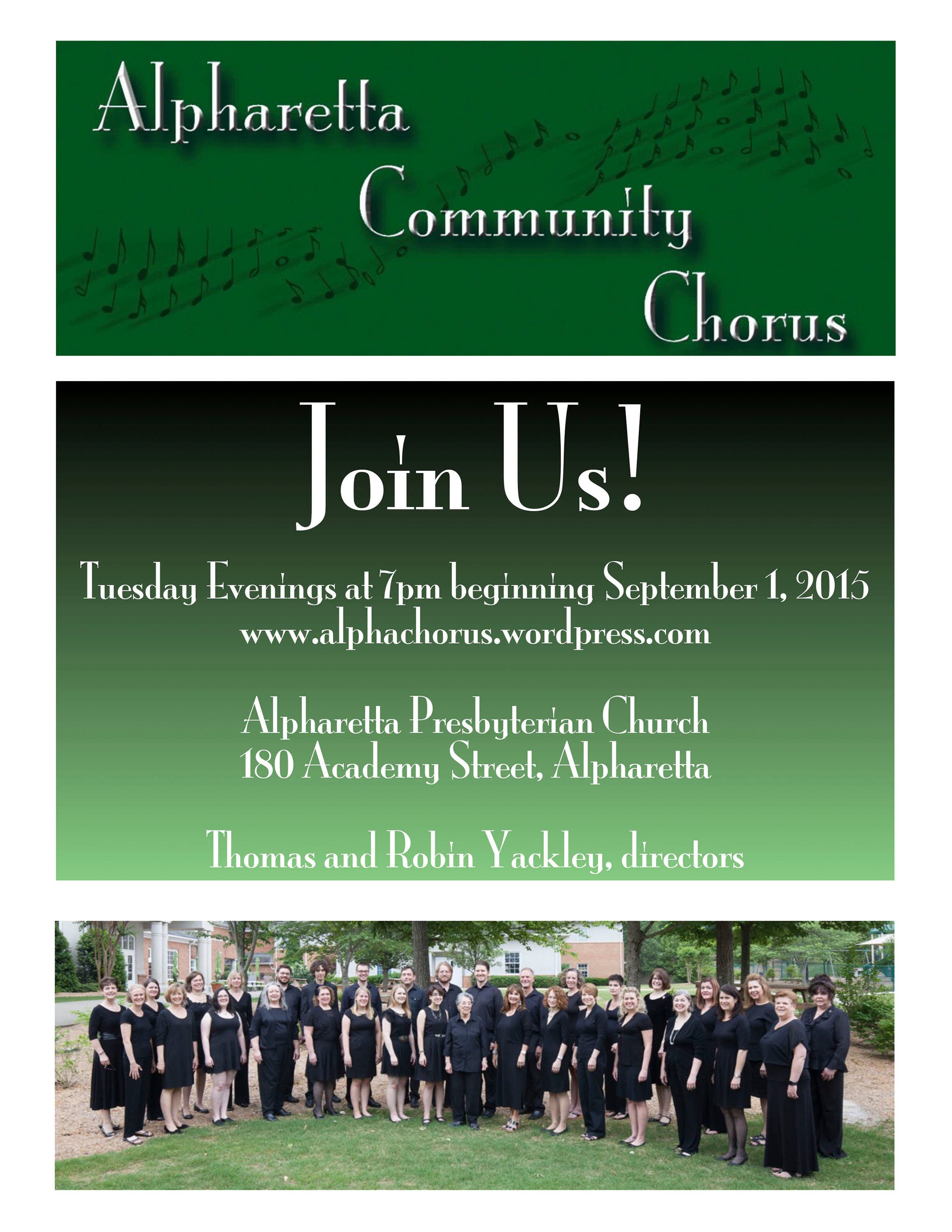 The Alpharetta Community Chorus, a 501(c)(3) organization, will begin its 3rd season September 1, 2015. The group offers an open invitation to local singers to join - no auditions necessary! Registration for new members will be at 6:30 PM prior to the first rehearsal.