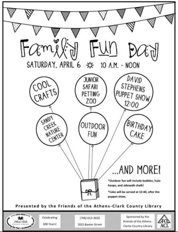 In the Children’s Department, families can look forward to Family Fun Day, sponsored by the Friends of the Athens-Clarke County Library on Saturday, April 6, from 10 a.m. to noon. The event will feature a petting zoo, crafts and other activities along with a puppet show finale with the ever popular David Stephens at noon. Yes, we’ll have birthday cake!